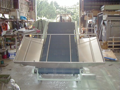 イリコ製造過程でイリコ定容量機より搬出された段積みセイロを煮込み 釜へと自動的に釜入れ釜出しする装置。<br />自動釜のイリコ煮込み時間は設定することができ、設定した時間に合わせて 自動的に釜入れ、釜出し作業を行う。走行部、昇降部、セイロ掴み部より構 成される。
